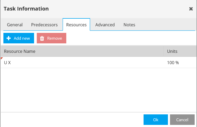 Select Resources tab – select name from drop down list and adjust Units% if not 100% | Select General tab – the default is units of days, if a different unit is required, user needs to manually update and enter the number and unit (e.g. 6 hrs) |