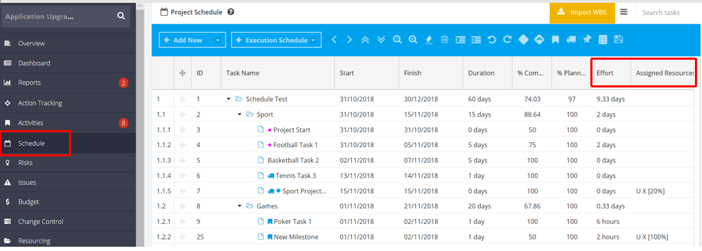 For Resource Planning in the Schedule, resources can be assigned against individual tasks. Also, there is an additional ability to capture planned effort if ‘Duration’ is Not Sufficient.