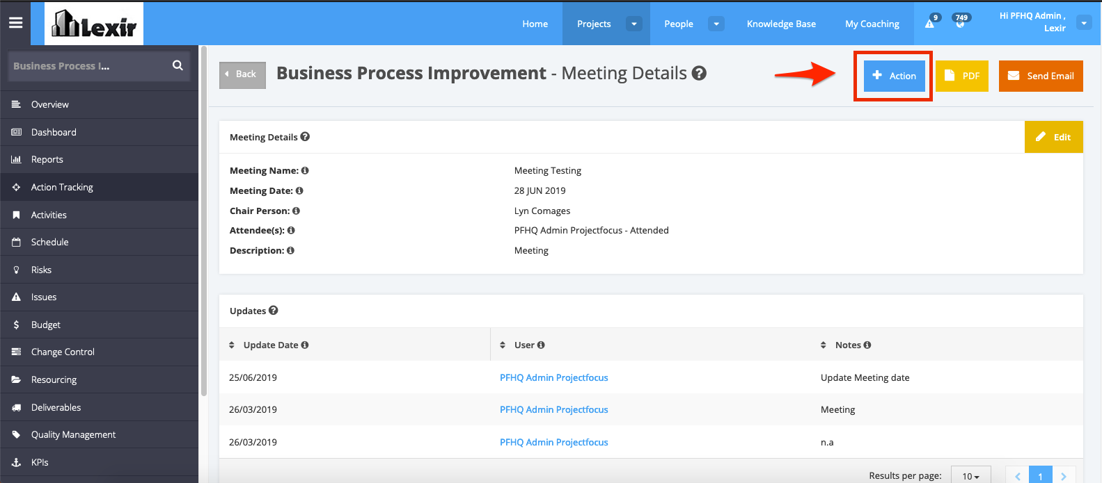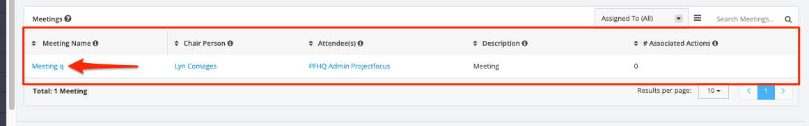 7. The Meetings will still be in the meetings section and the associated actions can be visible in the table.
