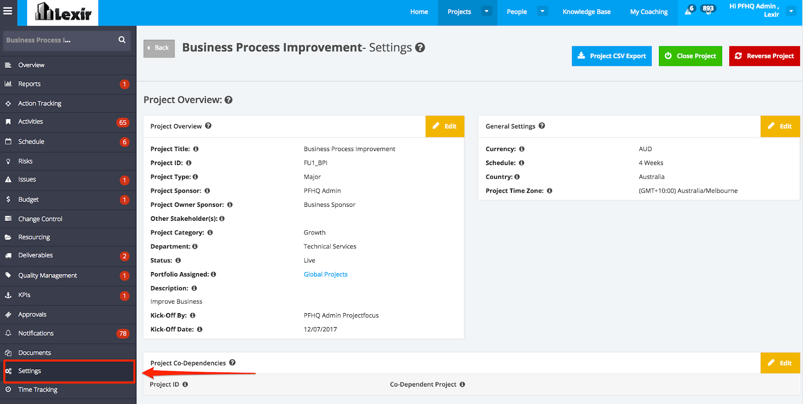 - In the ‘Project Dashboard’ section, click on the ‘Name’ of the ‘Project’ that you want to manage