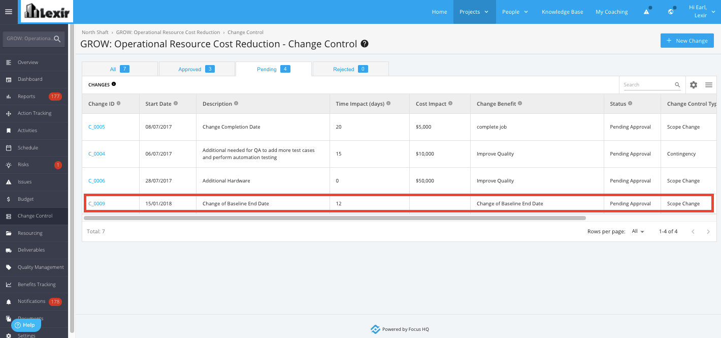 Note: Every created Change Control Request, whether User is an Approver or NOT, will go through an Approval Process. This will be reflected in the ‘Pending’ Status tab. (This action sends an Approval Request Email Notification to the Approver/s and action is added in the Project Actions Audit and Overall Actions Log).