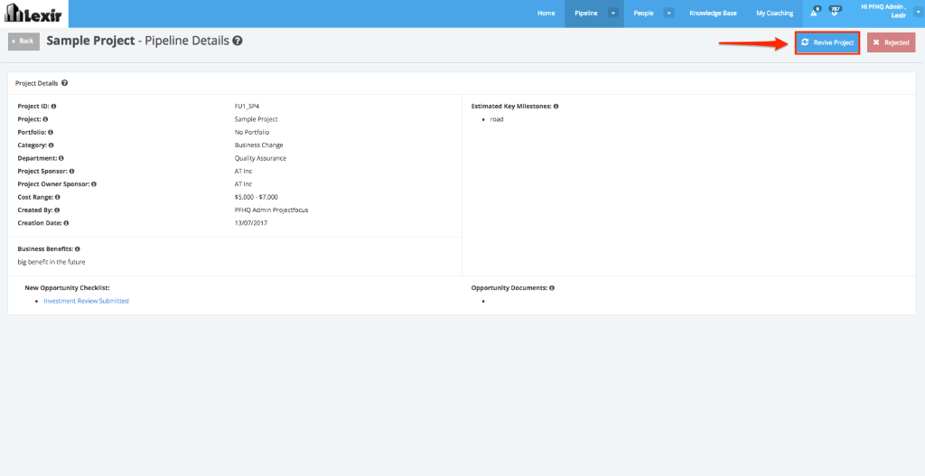 2. Once you reach the ‘Pipeline Details’ page, click the ‘Revive Project’