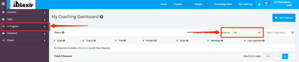 3. In order to display My Coaching ‘In Progress Requests’ table Module, go to the ‘Module’ drop-down menu and select any of the following options:
