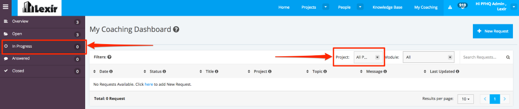 2. To display My Coaching ‘In Progress Requests’ table by Project, click on the ‘Project’ drop-down menu and select any of the following options: