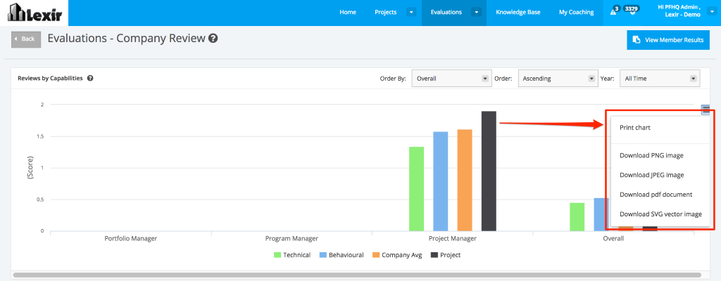 1. The ‘Reviews By Capabilities’ chart can be downloaded in a few formats: PNG Image, JPEG IMAGE, PDF Document or SVG vector image. To download, click on the ‘Menu’ icon located at the top right corner of the chart.