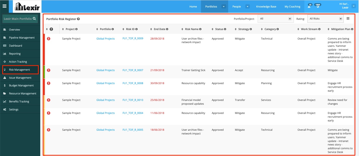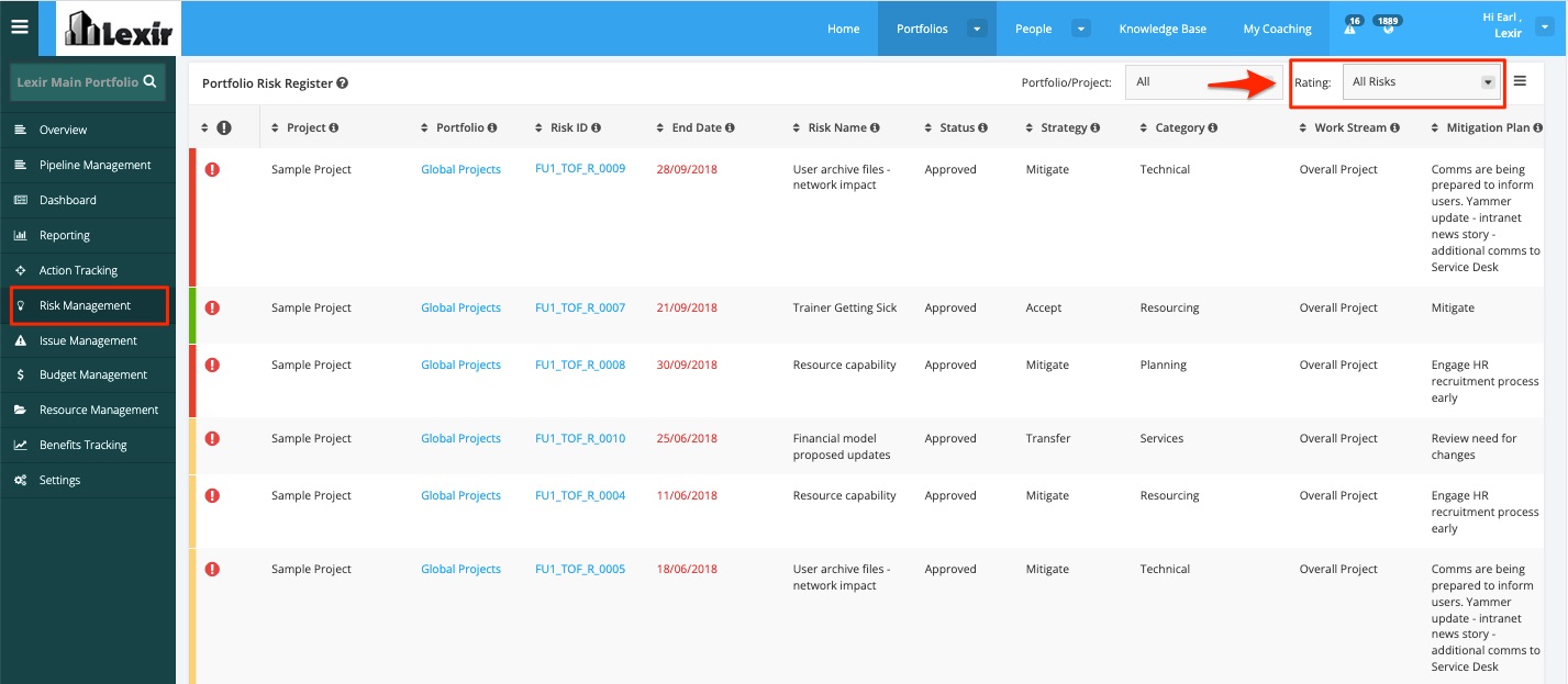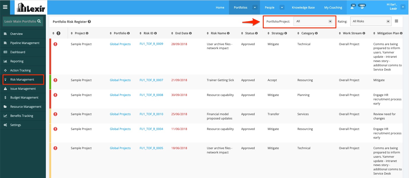 2. You can filter the ‘Portfolio Risk Register’ by ‘Portfolio/ Project’, or ‘Risk Rating’: