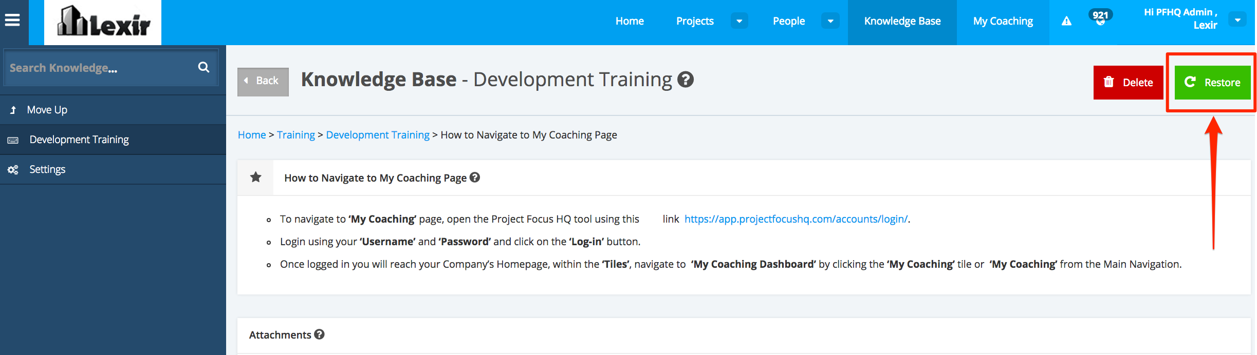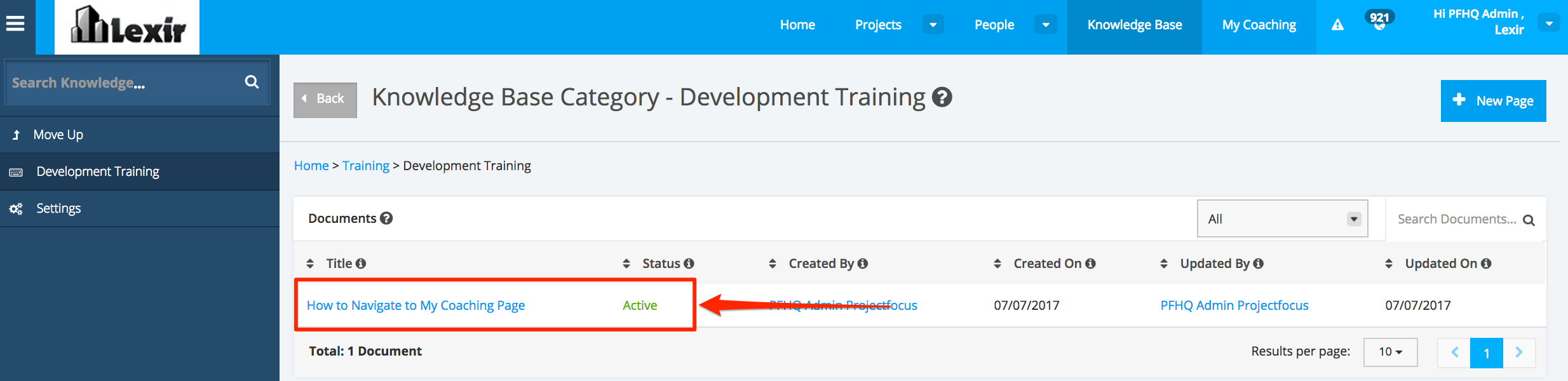 1. Go to the Knowledge Base Category where the ‘Page’ that you want to Restore belongs (E.g. ‘How to Navigate to My Coaching Page’ document saved in Training > Development Training category). Then click the ‘Title’ of the Page to Restore.