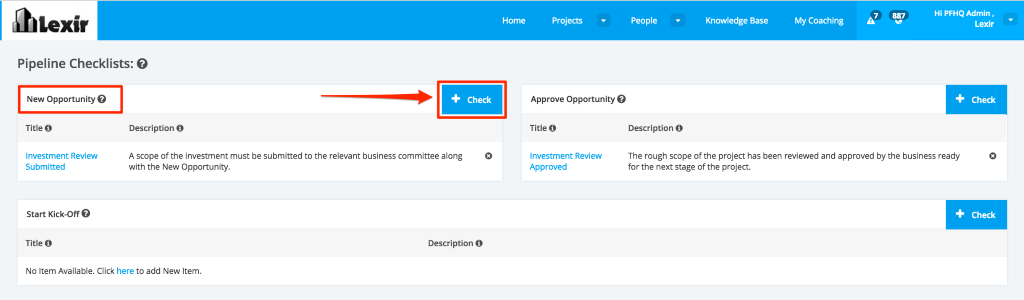1. When adding a ‘New Opportunity Checklist’ scroll down to the ‘Pipeline Checklists’ section then ‘New Opportunity’. This is where you can add and manage the Company’s Opportunity Checklists.
