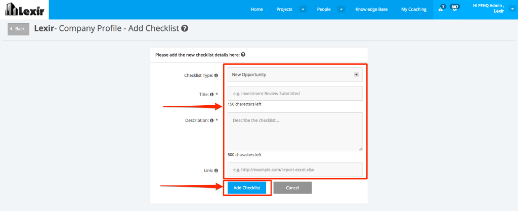 2. Fill in the ‘Checklist Type’, ‘Title’, ‘Description’ and ‘Link’ input fields with the desired data. Make sure that the data in the ‘Checklist Type’ field is ‘New Opportunity’. Once complete, click the ‘Add Checklist’ button to save changes.