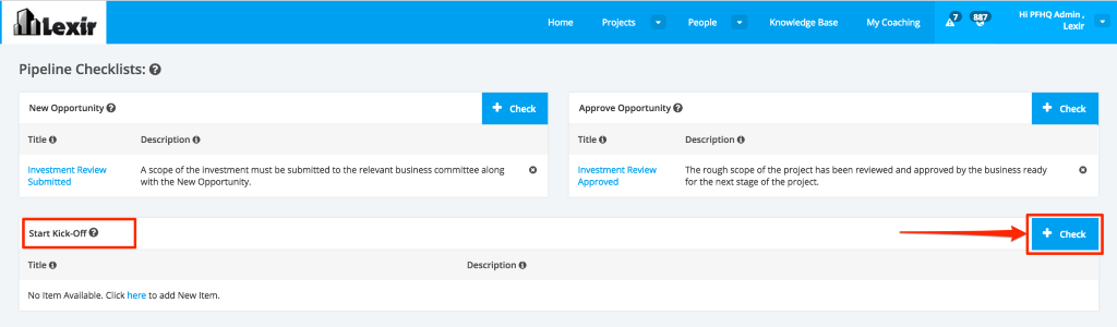 1. Once you reach the ‘Company Profile’, scroll down to the ‘Pipeline Checklists’ then ‘Start Kick-Off’. This is the section where you can add and manage the Kick-Off Checklists.