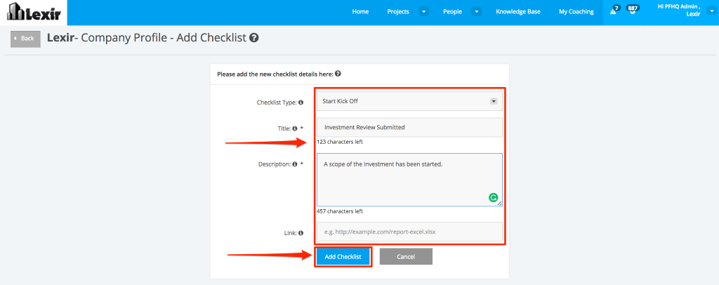 2. Fill in the necessary input fields ‘Checklist Type’, ‘Title’, ‘Description’ and ‘Link’ with the desired data. Make sure that the data in the ‘Checklist Type’ field is ‘Start Kick-Off’. Once complete, click on the ‘Add Checklist’ button to save checklist.