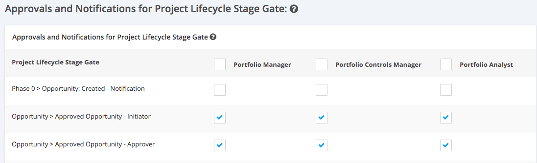 2. To assign an Approver and Initiator to a specific Project Lifecycle Stage Gate without triggering notifications, tick the checkbox of the Role for the Project Life Cycle Stage Gate items with an Approver and Initiator function.