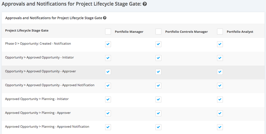 1. Within the Portfolio ‘Settings’ page, navigate to the ‘Approvals and Notifications for Project Lifecycle Stage Gate’ section.