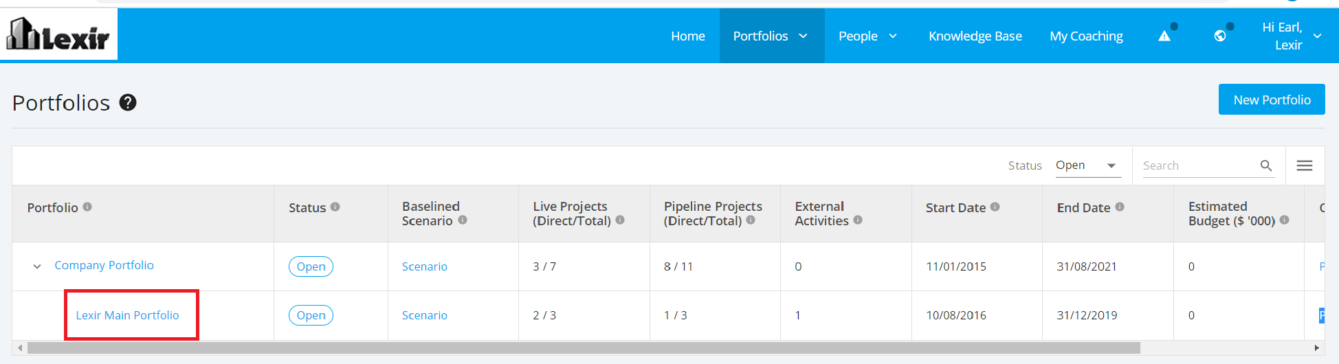 3. Within the Portfolio Dashboard, click the name of the Portfolio to be navigated.