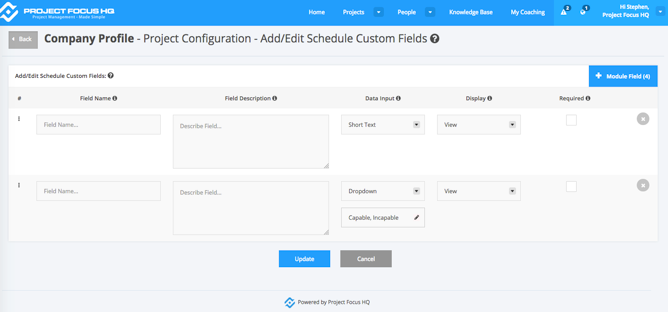 - Company Profile > Project Configuration > Project Modules - Add/Update/Remove Custom Fields (Schedule Module)