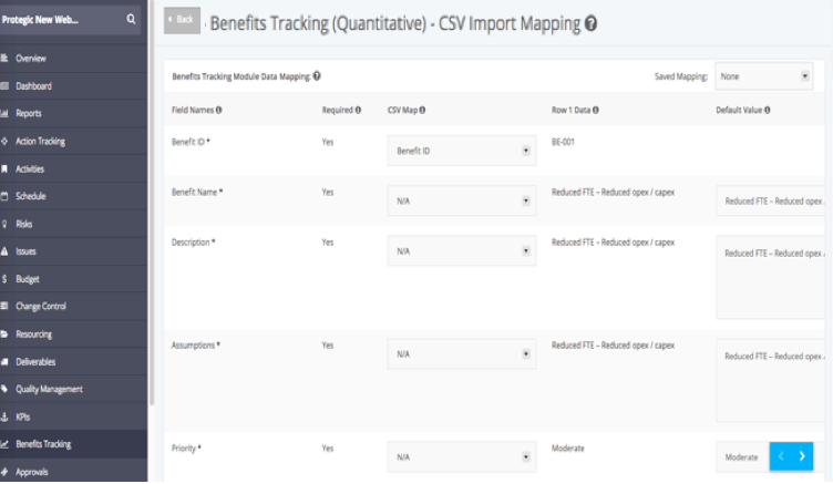 - This will give a user the ability to import a custom CSV file within the Project > Benefits Tracking Module. Users can either choose to import new, skip or overwrite existing data in the Module. This import will allow the user to map the Benefits Tracking Module fields to custom CSV Column Headers.