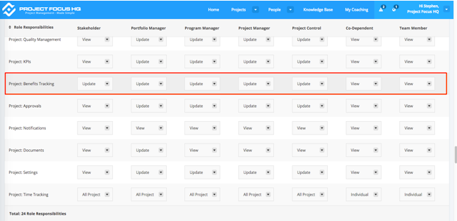 Access Levels > Benefits Tracking: User can assign a User Role's corresponding access rights to Benefits Tracking Module either be: None, View, Update