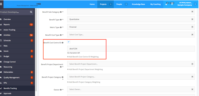 - Kick-Off/Live Projects/ Portfolio > Benefits Tracking - Change Cost Centre ID - AlphaNumeric
