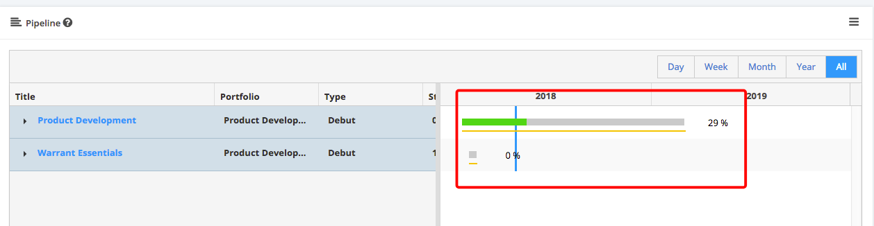 - Portfolio > Pipeline Management Gantt Chart > Display of Project Start Date to Baseline Finish Date