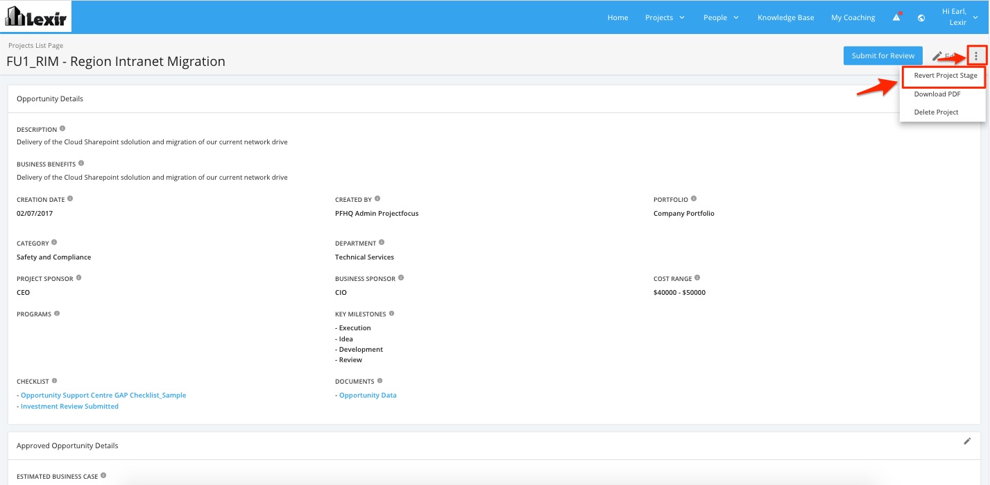 1. In the ‘All Projects’ page, click an Approved Opportunity project you want to reverse.