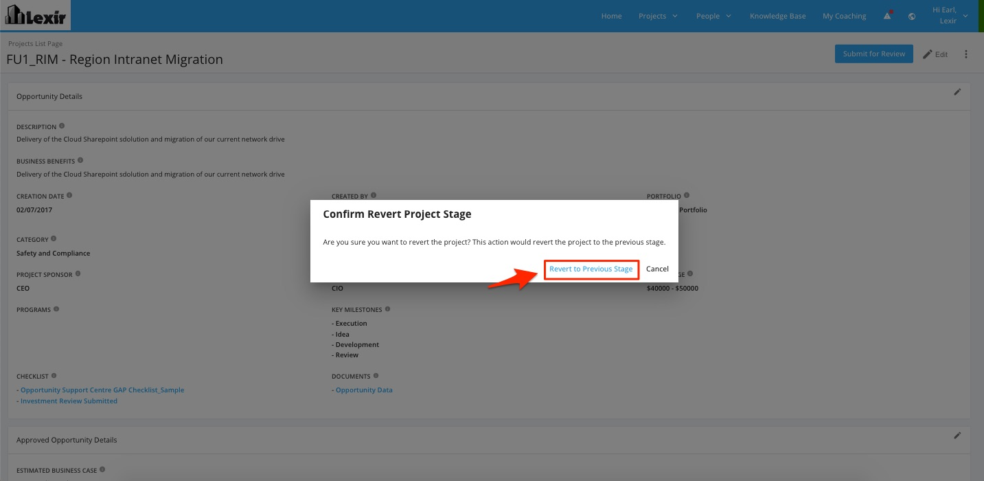 3. A pop-up will appear for confirmation. Click ‘Reverse to Previous Stage’ to proceed.