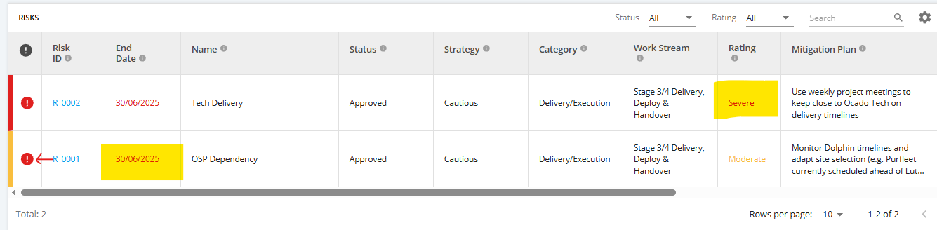 - Regular Risks and Issues only appear in the Risks or Issues Register.